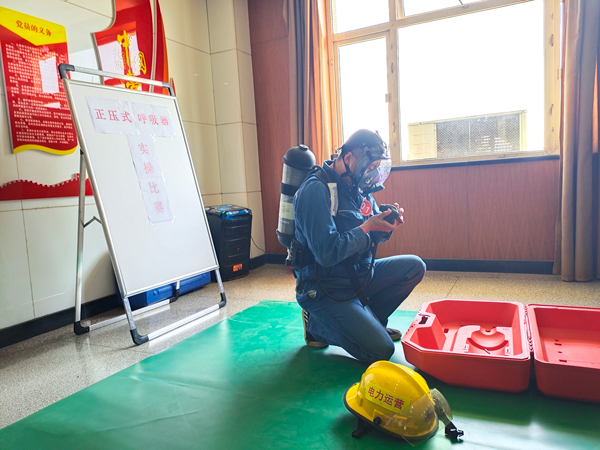 比賽開始,各代表隊展開激烈角逐。選手踴躍作答,評委犀利點評。搶答環(huán)節(jié)跌宕起伏、扣人心弦,將現(xiàn)場氣氛推向了高潮。正壓式空氣呼吸器實操比賽,渭河項目部戚華康一氣呵成,25秒完成正壓式空氣呼吸器佩戴全過程,贏得了全場熱烈的掌聲。
