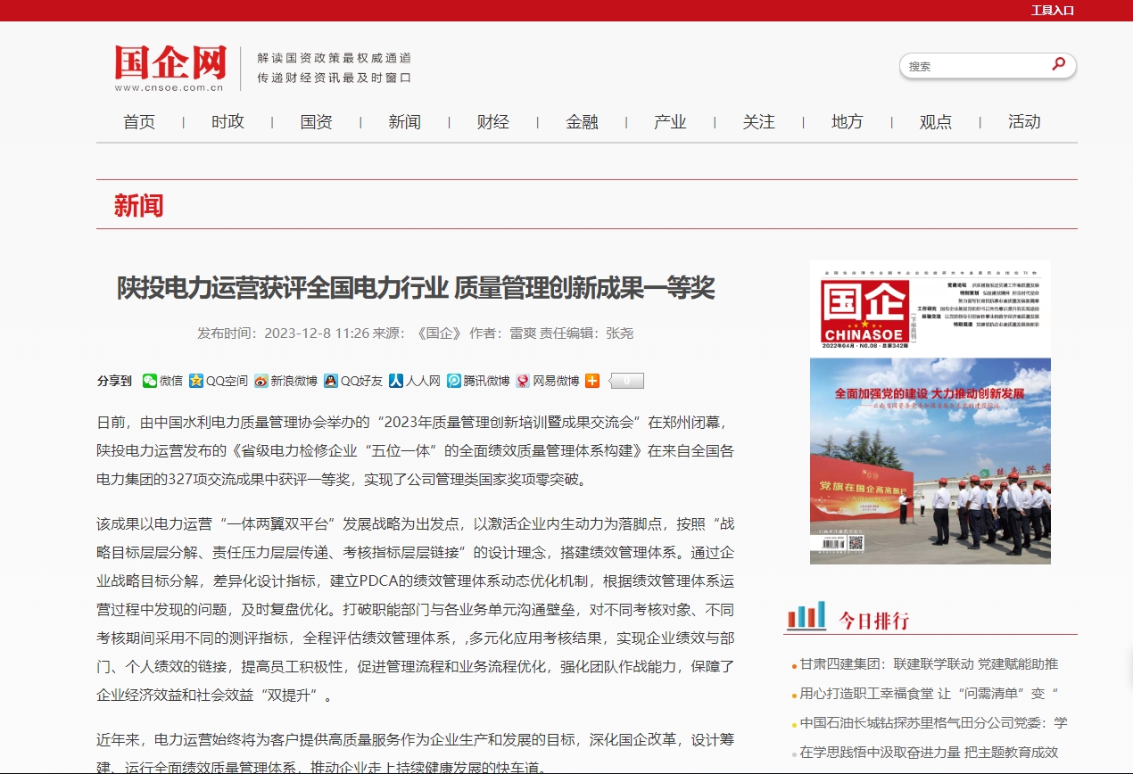 日前,由中國水利電力質量管理協(xié)會舉辦的“2023年質量管理創(chuàng)新培訓暨成果交流會”在鄭州閉幕,陜投電力運營發(fā)布的《省級電力檢修企業(yè)“五位一體”的全面績效質量管理體系構建》在來自全國各電力集團的327項交流成果中獲評一等獎,實現(xiàn)了公司管理類國家獎項零突破。
