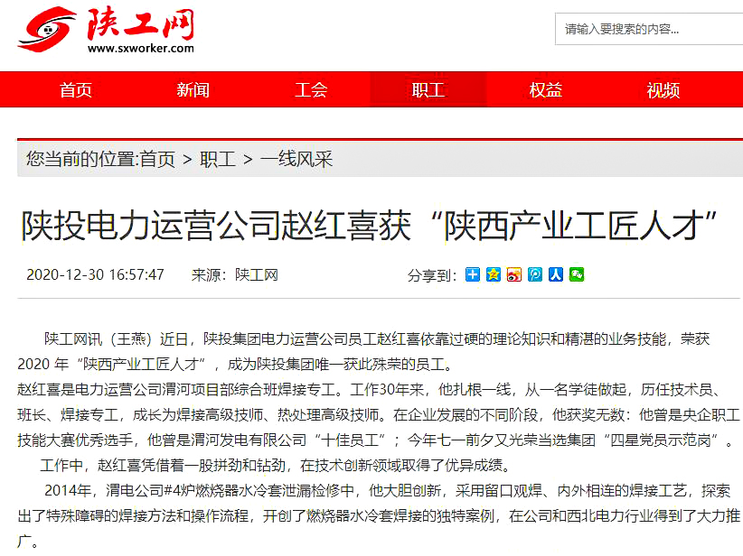 趙紅喜是電力運(yùn)營公司渭河項(xiàng)目部綜合班焊接專工。工作30年來,他扎根一線,從一名學(xué)徒做起,歷任技術(shù)員、班長、焊接專工,成長為焊接高級技師、熱處理高級技師。在企業(yè)發(fā)展的不同階段,他獲獎無數(shù):他曾是央企職工技能大賽優(yōu)秀選手,他曾是渭河發(fā)電有限公司“十佳員工”;今年七一前夕又光榮當(dāng)選集團(tuán)“四星黨員示范崗”。